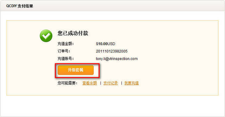 恭喜您已经充值成功,请点击“升级套餐”更新账户。