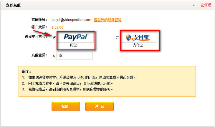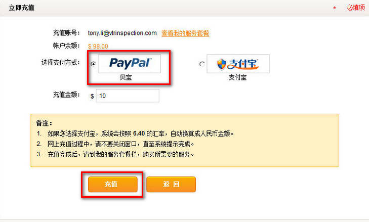 如果您选择贝宝,请先确认金额,再点击“充值”。