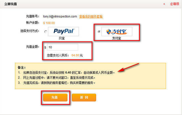 如果您选择支付宝,输入金额后,系统会按照6.40的汇率,自动换算成人民币金额。