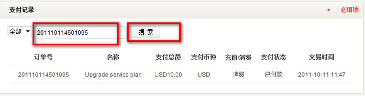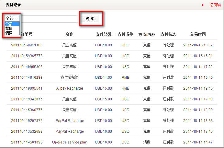 选择“全部”,“充值“或”消费“,点击“搜索”即可查询结果。
