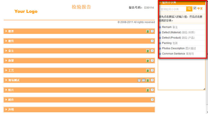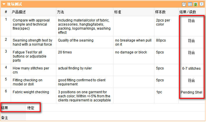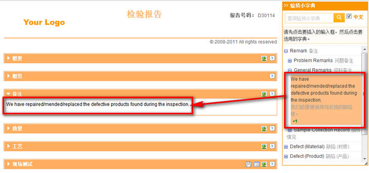 跟据选择的AQL,统计货物在工艺方面的瑕疵(致命的、主要的、次要的)情况。在下拉菜单中选择了检验水平、各缺陷的AQL后,系统可自动计算出样品数和各缺陷的允收值。批数量从报告的数量部分获取。可利用“查询验货小字典”更快、更准确找到合适的描述。可把瑕疵的具体情况记录在备注。