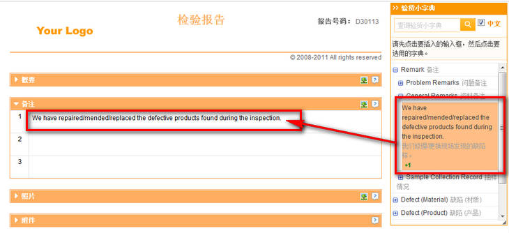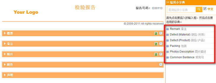 页面设有查询验货小字典,里面包括备注,材质缺陷,产品缺陷,包装,图片描述和常用句的中英对照。