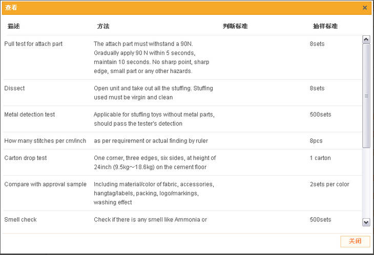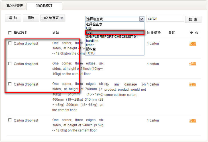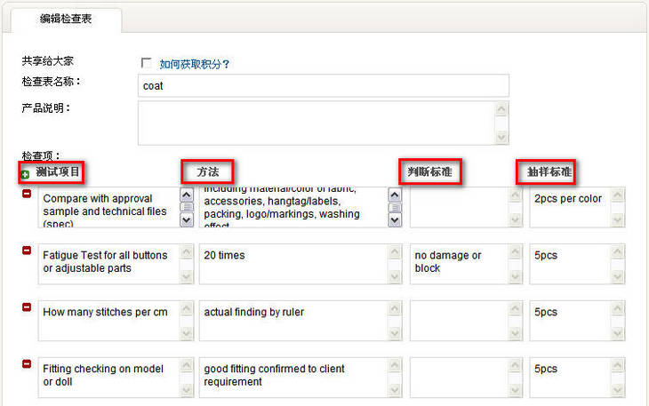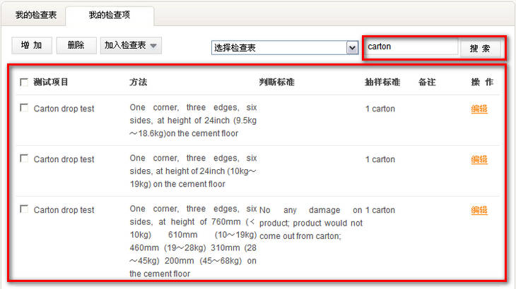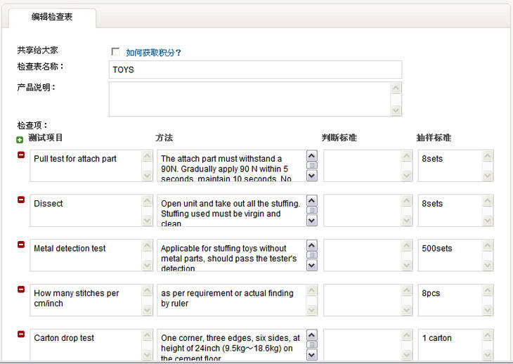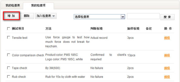 点击“增加”,描述你检查的产品并列明其检查方法和相应的判断标准、抽样标准。 填完后,点击“保存”。若需要继续添加,则点击“保存并继续增加”。