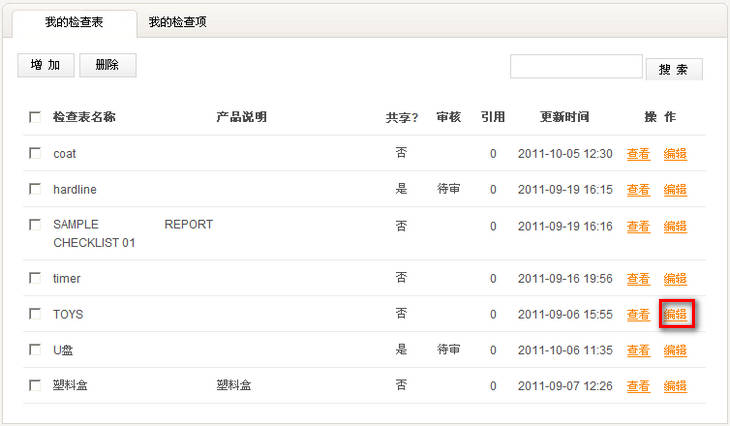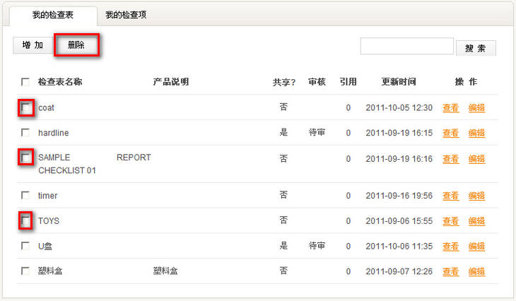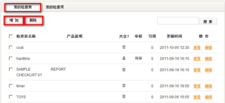 在“我的检查表”页面,你可以看到“增加”、“删除”按钮。