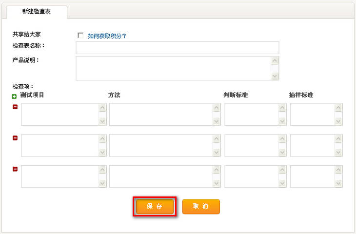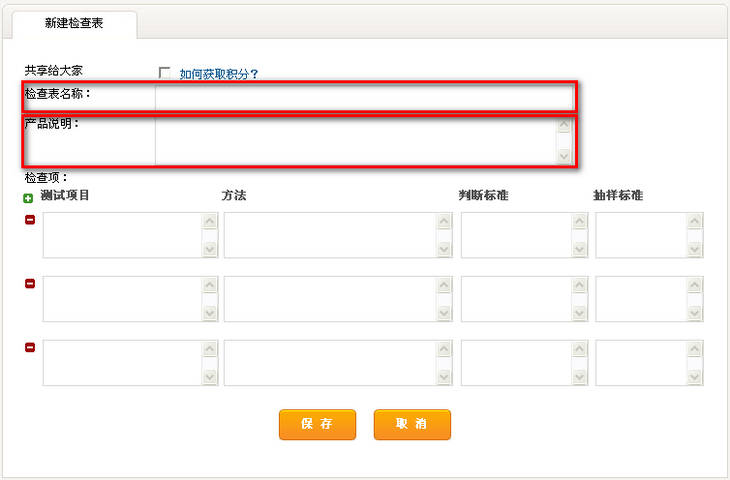 点击“增加”,可新建检查表,在“检查表名称”及“产品说明”中分别填入相应的内容。