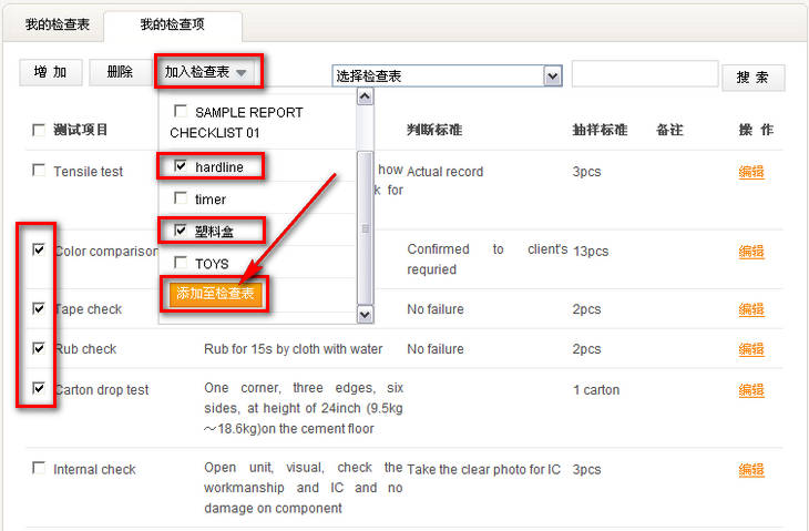 点击“加入检验表”,将选中的一个或多个检验项加入到检查表中。选中检验项,点击“加入检查表” ,选择所需加入的检查表,再点击“添加至检查表”即可完成操作。
