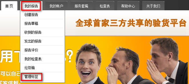 把鼠标移到顶部菜单中的“我的报告”,弹出菜单后点击“管理标签”