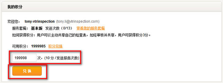如需兑换报告发送次数,只需在框中输入次数(10分/发送报告次数)并点击“兑换”。若积分不足,则无法兑换。
