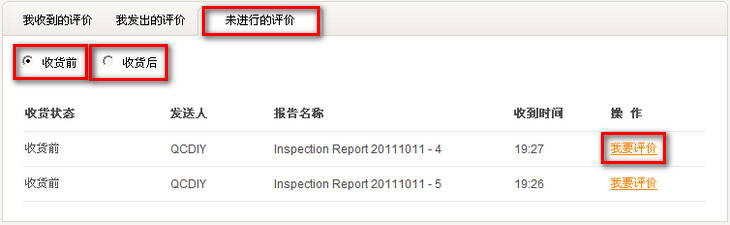 4.你可以通过“未进行的评价”查看你还没有作出的评价。点击“收货前”查看你对还未收到货未作出的评价;点击“收货后”查看你对已收到货未作出的评价:页面可以显示报告号以及收货前和收货后作出的评价。点击右下角的“回复”会跳出回复对话框,输入内容,点击“回复”即可对所收到的评价作出回复。点击右边的“我要评价”便会跳出评价对话框。