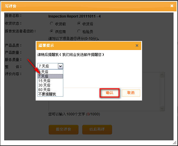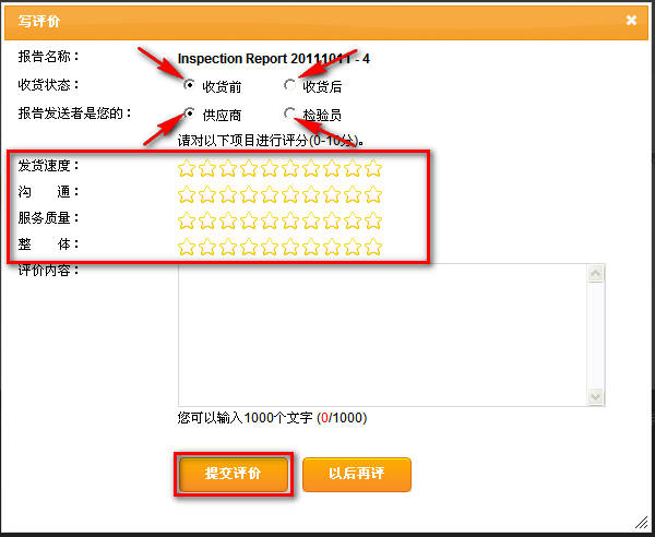 5. 在此页面,请在收货状态选择“收货前”或“收货后”,在报告发送者选择“供应商”或“检验员”。然后即可对报告的各项内容作出评分,也可以在评价内容里留言。点击“提交评价”即可完成操作。