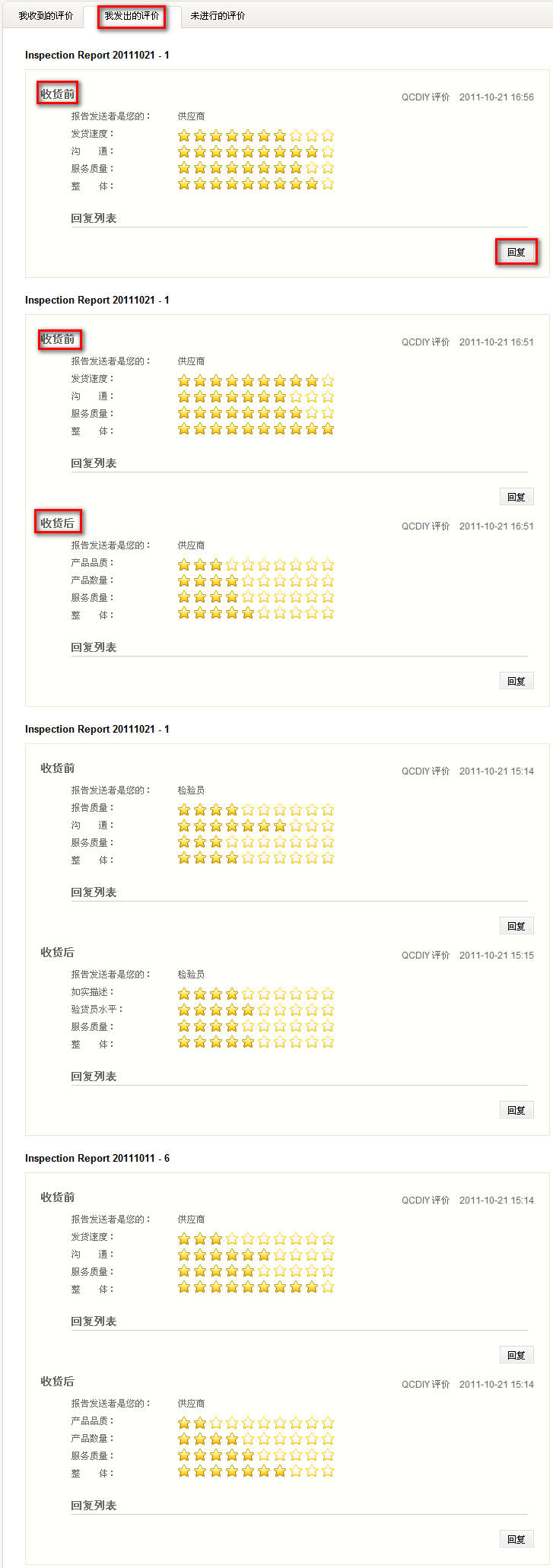 3.你可以通过“我发出的评价”查看你已经作出的评价。页面可以显示报告号以及收货前和收货后作出的评价。点击右下角的“回复”会跳出回复对话框,输入内容,点击“回复”即可对所收到的评价作出回复。