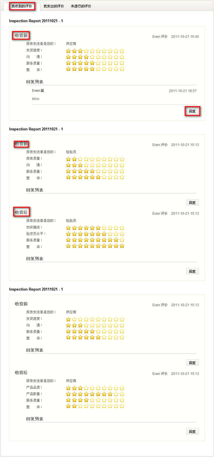 2.你可以通过“我收到的评价”查看你所发出的报告的评价记录。页面可以显示报告号以及客人在收货前和收货后作出的评价。点击右下角的“回复”会跳出回复对话框,输入内容,点击“回复”即可对所收到的评价作出回复。