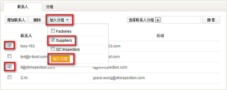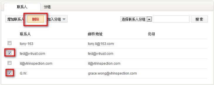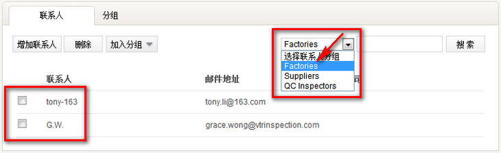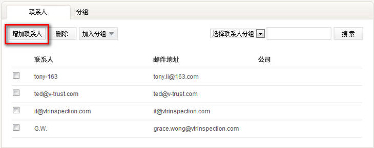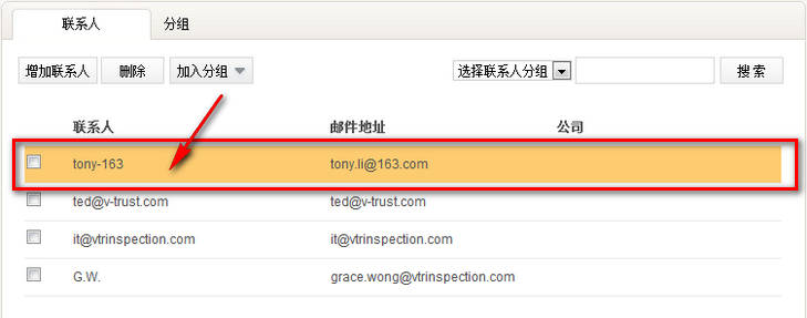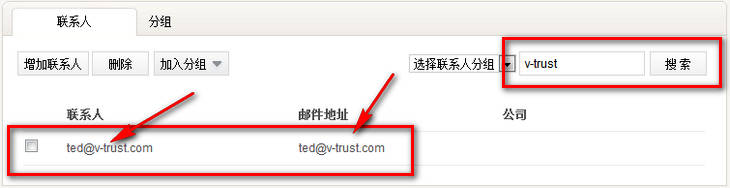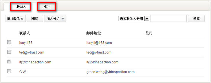 若需要查询分组下的联系人,只需在联系人页面的“选择联系人分组”下拉项中选择所需查询的分组,点击“搜索”即可。