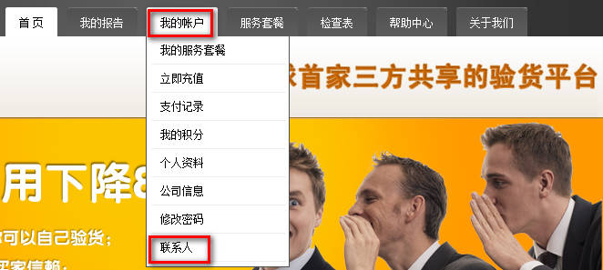 登录后,把鼠标移到顶部菜单中的“我的账户”,弹出菜单后点击“联系人” 。