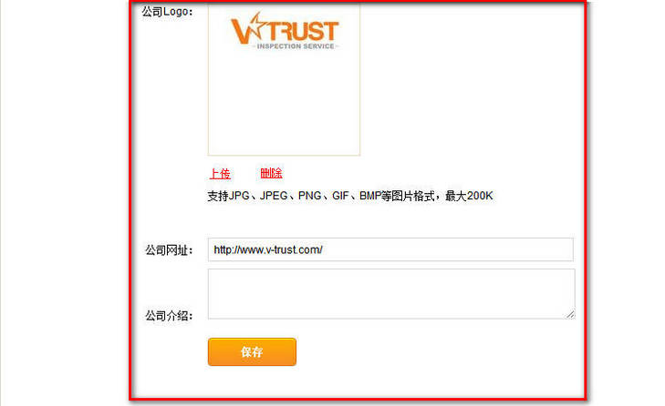 如需要上传公司商标,请点击“上传”,最大限制200KB,支持JPG, JPEG, GIF, PNG 和BMP格式,点击保存即可!